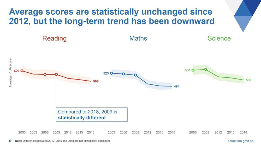 Bear in mind that this piece is written by an education policy expert at the Gonski Institute – the very same Gonski whose “reforms” were enacted a decade ago. Yet, despite the billions more spent in the name of Gonski, Australia’s education standards continued to decline. New Zealand hasn’t done much better: while Kiwi test scores remain marginally higher than Australia’s, the decline in standards has followed an almost identical path. Look across the Tasman, O ye Kiwis, and despair.