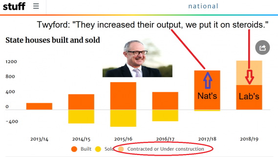 Not to be out-shone, Mr Twyford simply introduced a new tint to the bar-graph. The beigey bits are not actual houses, they are contracts. You can’t live in a contract, and houses under construction are extremely unlikely to be counted as completed in the 18 days before HNZ year-end.