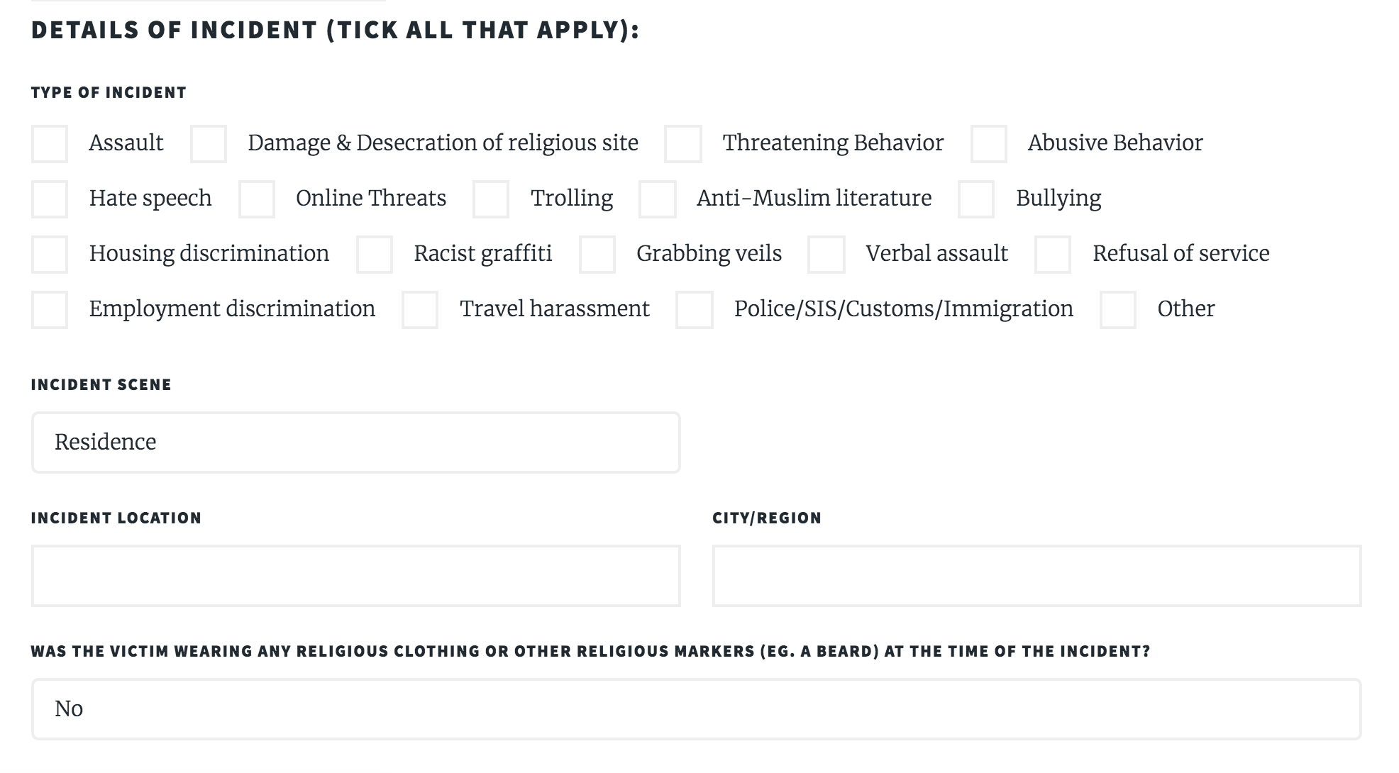 One of the key projects of FAIR is to provide a Report Islamophobia (http://report.islamophobia.) portal where victims can report incidents.