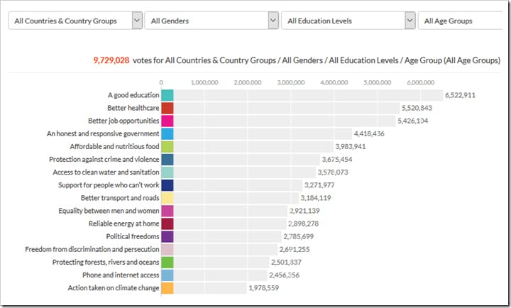 The last is a point which must be emphasised: in the UN’s survey, respondents don’t nominate their own issues. They’re presented with a list of 16 issues the UN wants them to prioritise. Climate change is one of them — and it’s put last, every time.