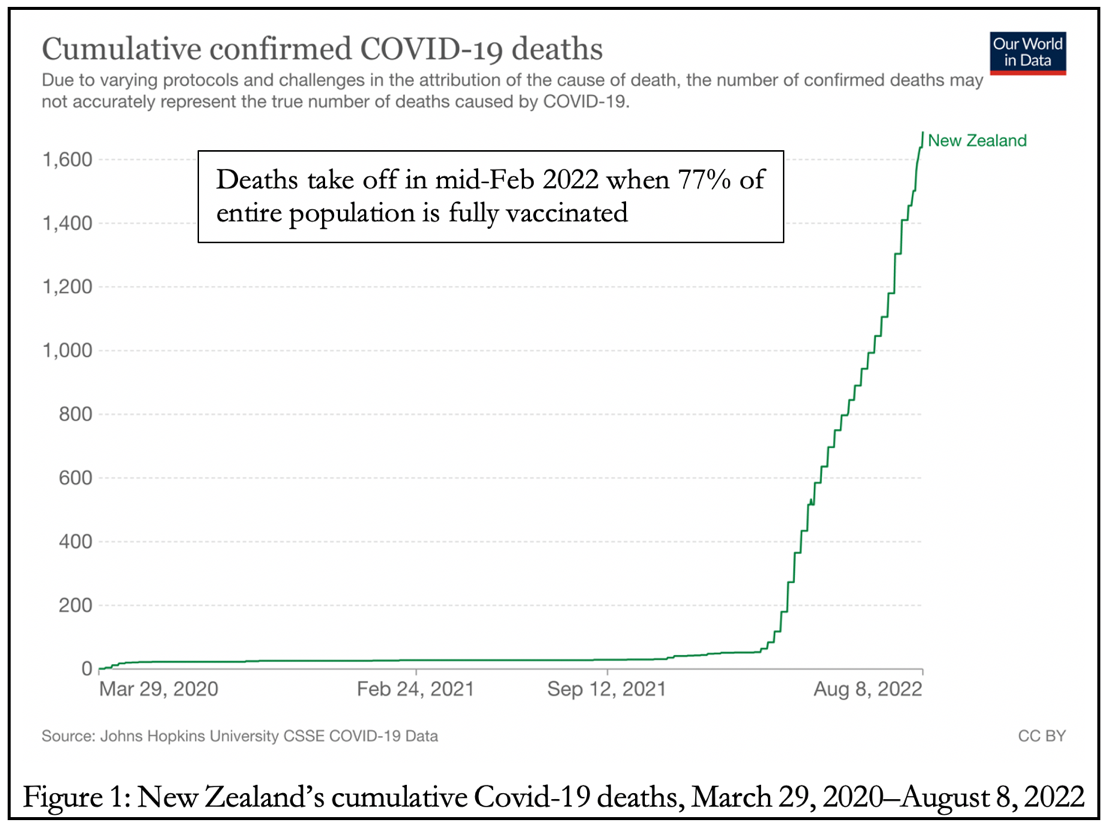 In combination with domestic isolation requirements, the prolonged strict border control measures kept New Zealand’s Covid mortality down to around 50 until the end of 2021 (Figure 1). But by this time Covid was deeply seeded in the world’s major population centers. Accordingly, unless New Zealand were to shut itself off permanently from the rest of the world, an impossible stipulation, the eradication strategy was already doomed.