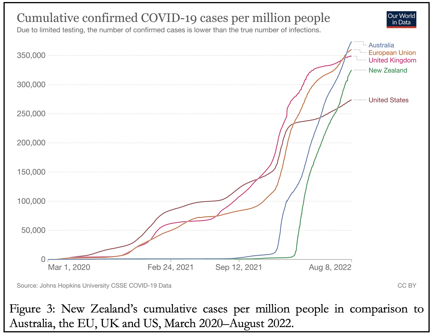 By August 2022, New Zealand’s cumulative Covid-19 cases per million people had surpassed the US and was on track to catch up with the UK and EU. Australia was ahead of all of them. To be fair, though, by this date Australia still had a Covid-death toll only about one-fifth to one-sixth, and New Zealand between one-seventh to one-ninth, of the European, British and American figures (Figure 3).