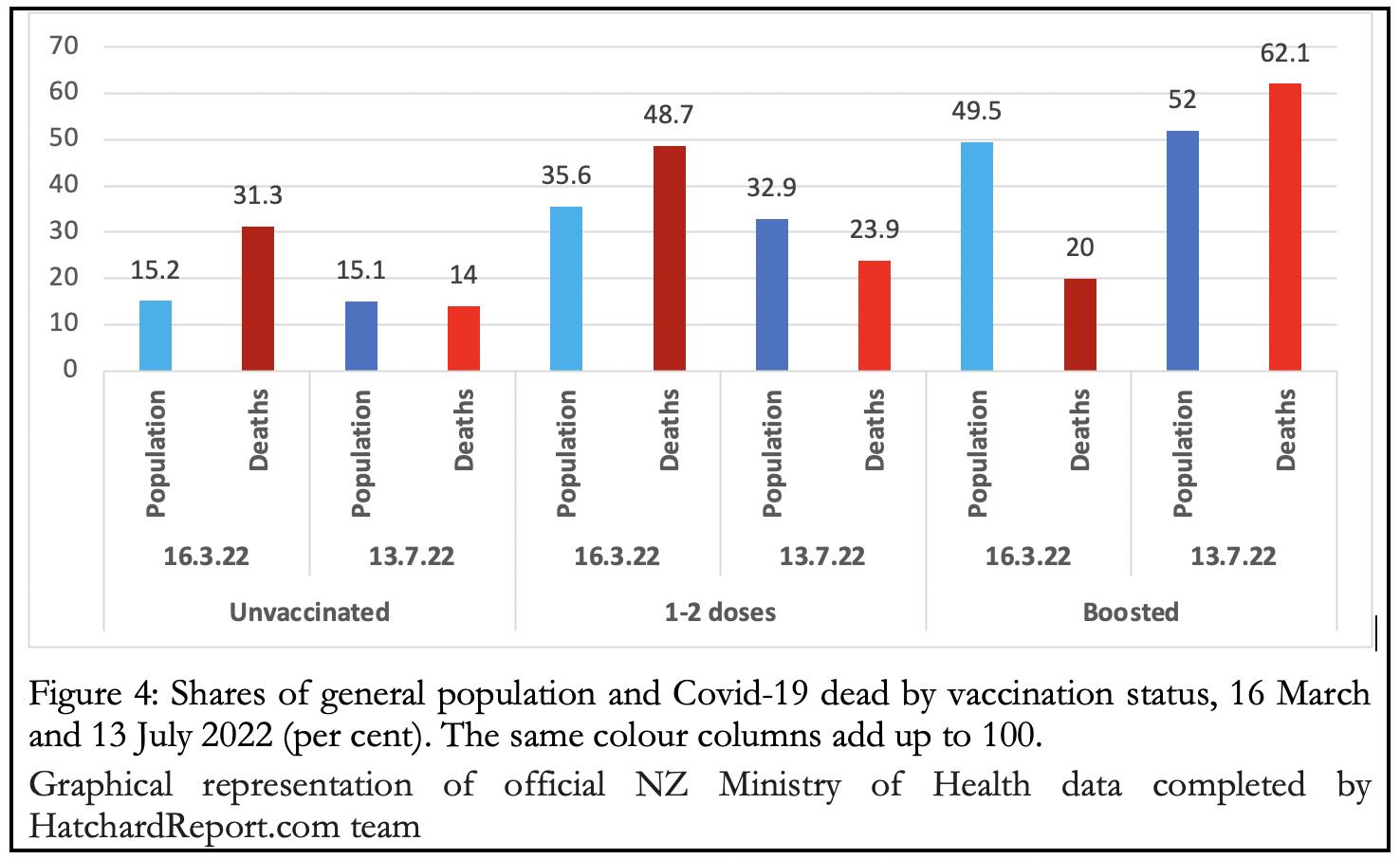 The dramatic turnaround can be seen in Figure 4. As late as mid-March this year, the narrative of a pandemic of the unvaccinated was still plausible, as they comprised more than twice the number of Covid dead compared to their share in the general population, while the boosted dead were only around 40 per cent of their population share.