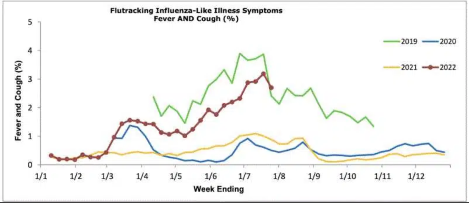 The Ministry of Health and mainstream media have been talking vaguely about a bad flu season, but a quick check of the FluTracking website reveals that the 2022 flu season is not even as bad as 2019.