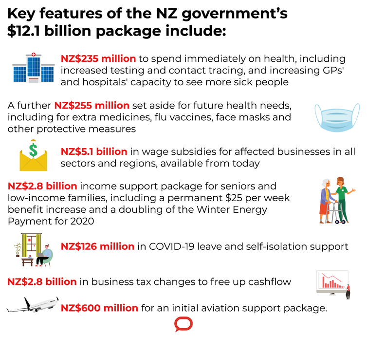 The NZ government’s new economic package is roughly equivalent to 4% of New Zealand’s annual gross domestic product – “dwarfing” Australia’s coronavirus response to date, according to The Conversation’s Australian business editor Peter Martin, and going further than US or UK government responses.
