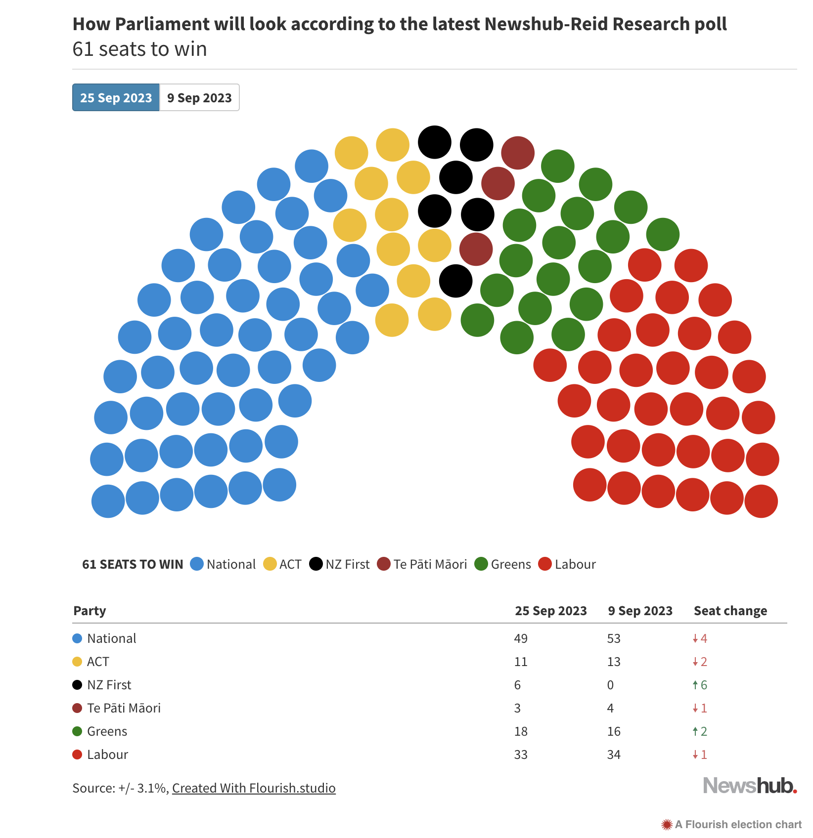 Both Labour and National have taken a dive, while Peters’ New Zealand First has crossed the threshold. He’s coming back to Parliament on these numbers and the Kingmaker crown is sitting atop his head once more.