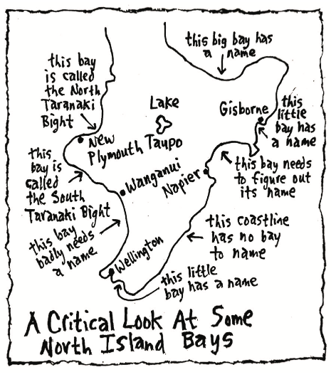 There is a bay on the northeast coast of the North Island. A big bay. The biggest bay on the east coast of the North Island. It has a name. It has three names. It is called Hawke’s Bay, it is called Hawkes Bay, and it is called Hawke Bay. It is Hawke’s Bay in one place, Hawkes Bay in another, and Hawke Bay in another. It doesn’t matter if its name historically is Hawke Bay, it still gets called Hawke’s Bay, Hawkes Bay or Hawke Bay.