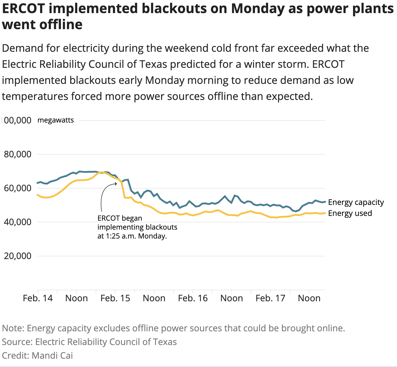 By Wednesday, those numbers had changed as more operators struggled to operate in the cold: 45 gigawatts total were offline, with 28 gigawats from thermal sources and 18 gigawatts from renewable sources, ERCOT officials said.