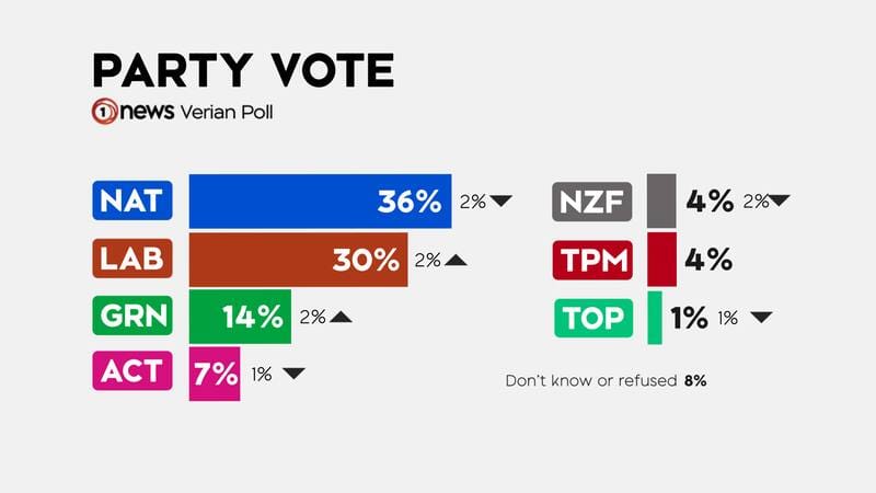 According to the poll, if an election were held today National would still be the biggest party in Parliament with 36% of the party vote, down 2% on the last 1News Verian Poll.