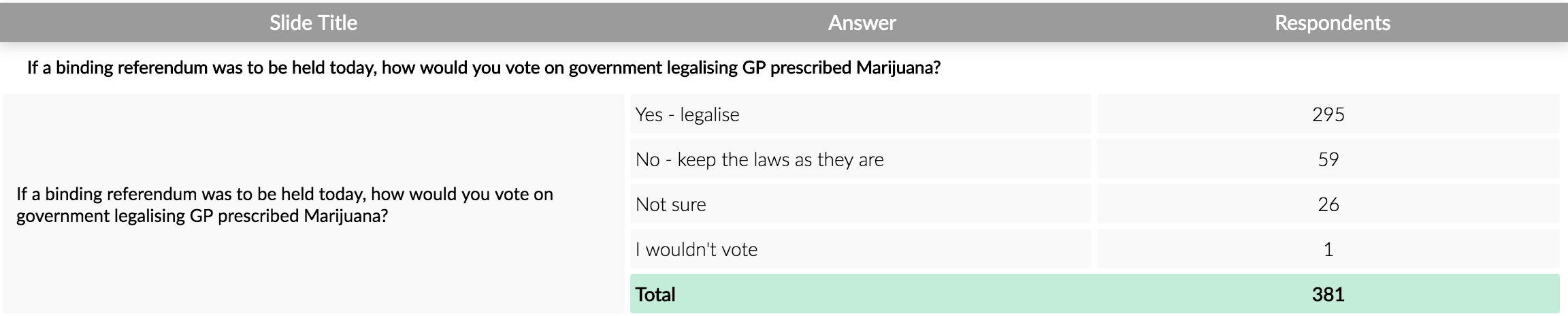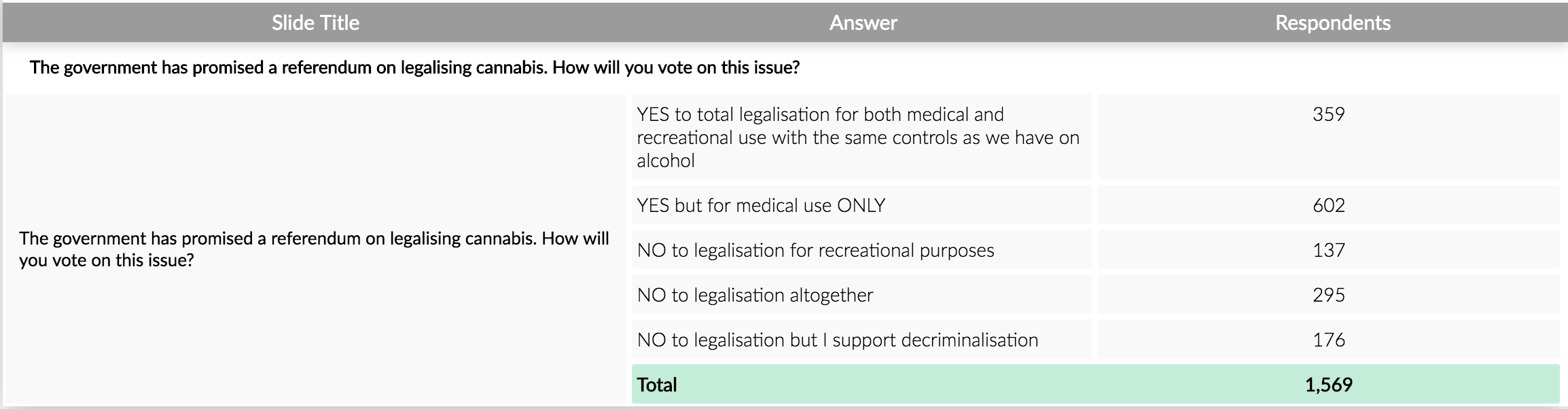 When we polled our readers November last year again it was clear that our readers were in favour of legalising it for medical use but were not keen on recreational use.