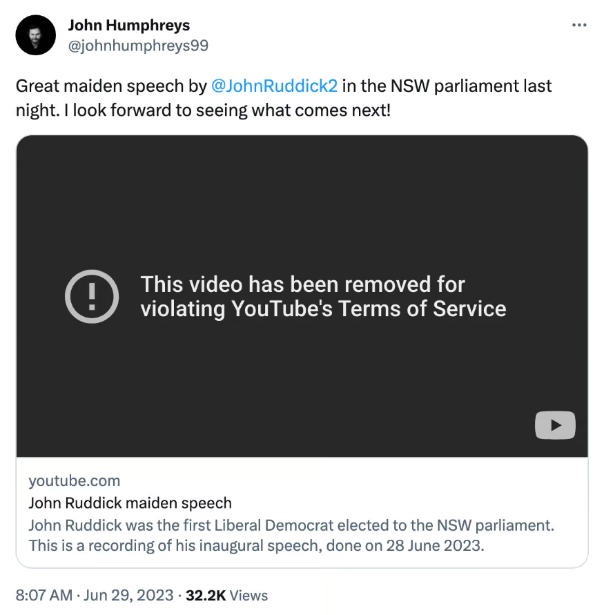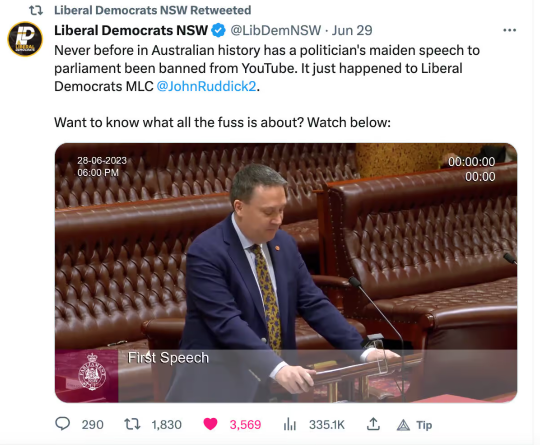Nevertheless, what is socially acceptable offline is not necessarily acceptable on social media. YouTube swiftly removed Ruddick’s speech from its platform, just seven hours after it was uploaded. The NSW Liberal Democrats say this is the first time in Australian history that a politician’s maiden speech has been censored by the platform.