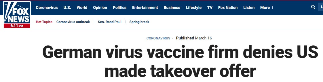 The Tübingen-based company on Sunday and Monday rejected reports that Trump had attempted to snatch up exclusive rights to the firm’s coronavirus vaccine, which is currently being developed in cooperation with a taxpayer-funded German institute.