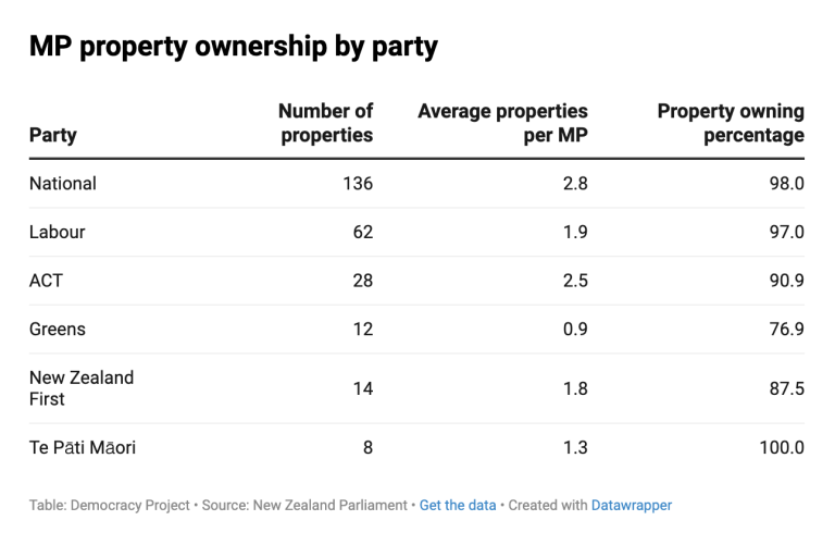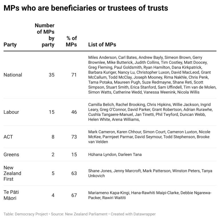 Politicians must list their involvement with trusts – including if they are the beneficiary or trustee of a trust and if their properties are in trusts. In total, 69 MPs use at least one trust. National has the most MPs with trusts – 35 MPs (or 71 per cent of the caucus). All but one of the ACT MPs have at least one trust, and the same is true for NZ First. And the Cabinet has an exceptionally high proportion of ministers using trusts – 75 per cent.