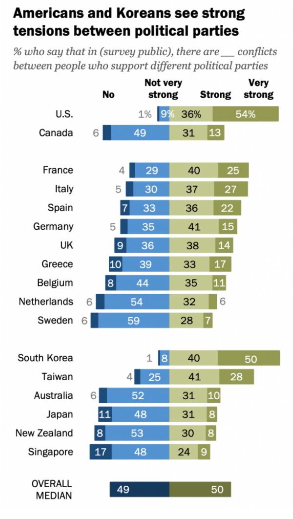 However, there is some recent research on New Zealand and other advanced economies to show that this country is relatively harmonious. The Pew Research Centre has just released its report, “Diversity and Division in Advanced Economies”, about political polarisation in seventeen advanced economies. This shows the results from its Global Attitudes Survey about tensions between groups and politics in different countries.