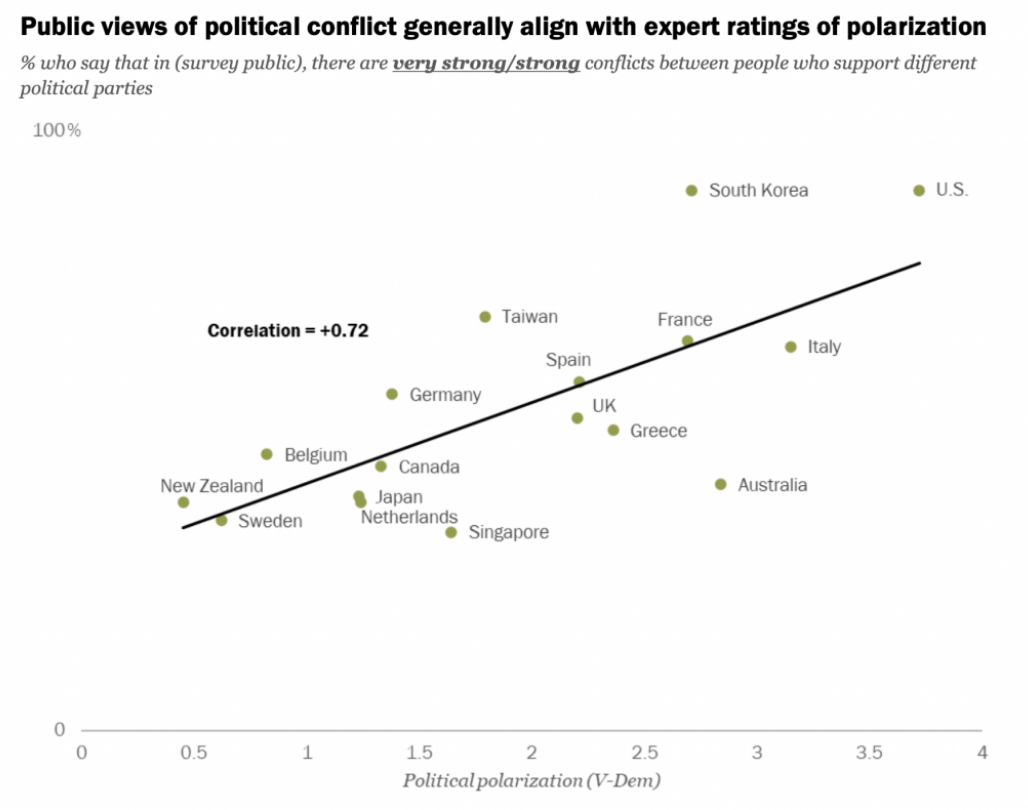 In reporting the above levels of polarisation as determined by the survey of public perceptions, the Pew Research Centre report also compares this to results from a survey of experts in the various countries. This information from a separate survey is very much in line with the results – and can be seen in the graph below.