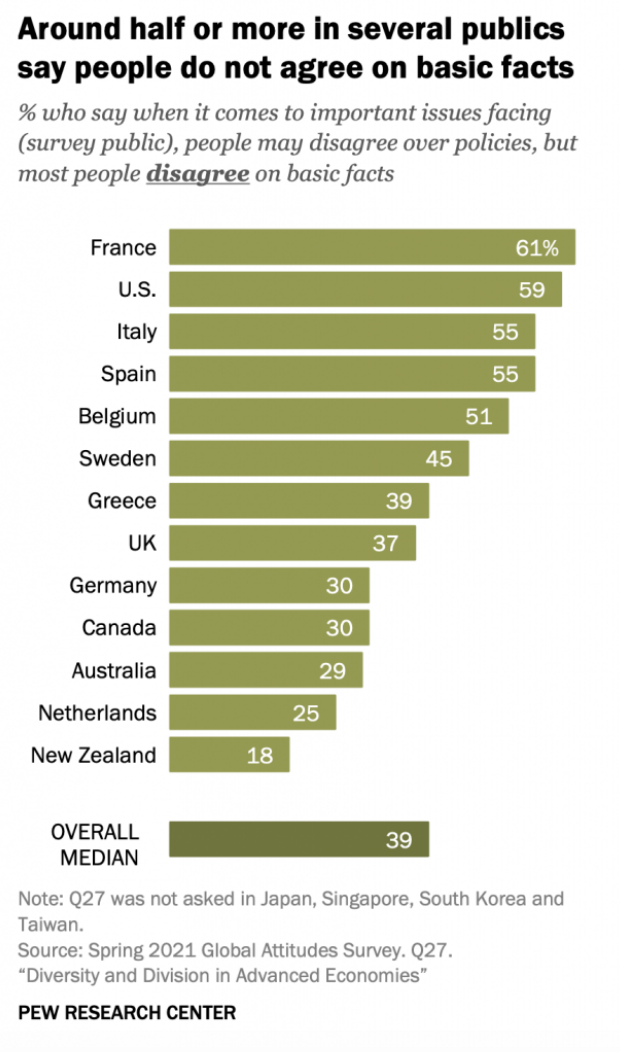 One key measure of political and society dysfunction is the extent to which people disagree over the facts that are being debated – whether it’s climate change, Covid, or inequality. Measures of disagreement over basic facts are something of a proxy for levels of polarisation.