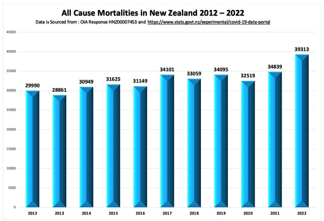An official information act response received recently has allowed for clearer analysis of data which is not always available from StatsNZ. In the five years pre-pandemic, 2015 to 2019, the average number of annual deaths was 32,805. In 2022 a total of 39,313 deaths were recorded. This is an increase over the pre-pandemic average of 6,508 deaths, or around 17 per cent higher than the expected average. This difference between expected deaths (around 32,805) and actual deaths (39,313) is what is referred to as ‘excess deaths’. Similar stats are being seen in the other most vaccinated countries.