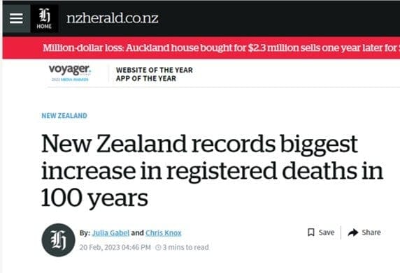 According to the NZ Herald and other mainstream outlets, the unprecedented increase in deaths of New Zealanders which occurred last year can be blamed on Covid-19. They claim a reference to NZStats, who in fact do not provide information on cause of death. In fact, during 2022 a total of 2,367 deaths were recorded as having a positive Covid test, of which 1,458 had Covid as the underlying cause of death.