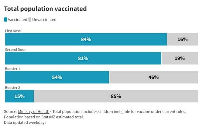 Of these 2,367 deaths, 1,719 (72 per cent) had received a booster dose. According to RNZ: Covid-19 Data Visualisations (last updated 4 January 2023), only 54 per cent of the population had a first booster and only 15 per cent have had a second booster.