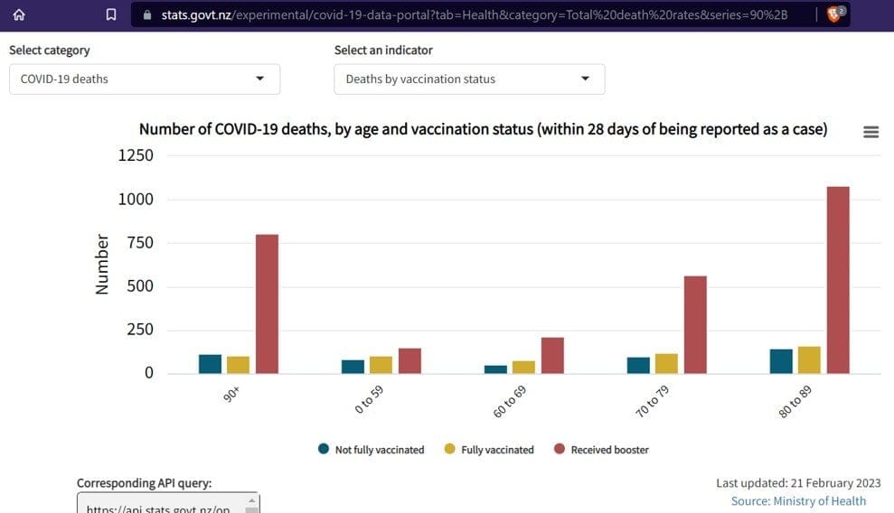 StatsNZ released the following information on 20 February 2023, suggesting a strong safety signal relating to the boosters, especially for older age groups. This is neither safe nor effective.