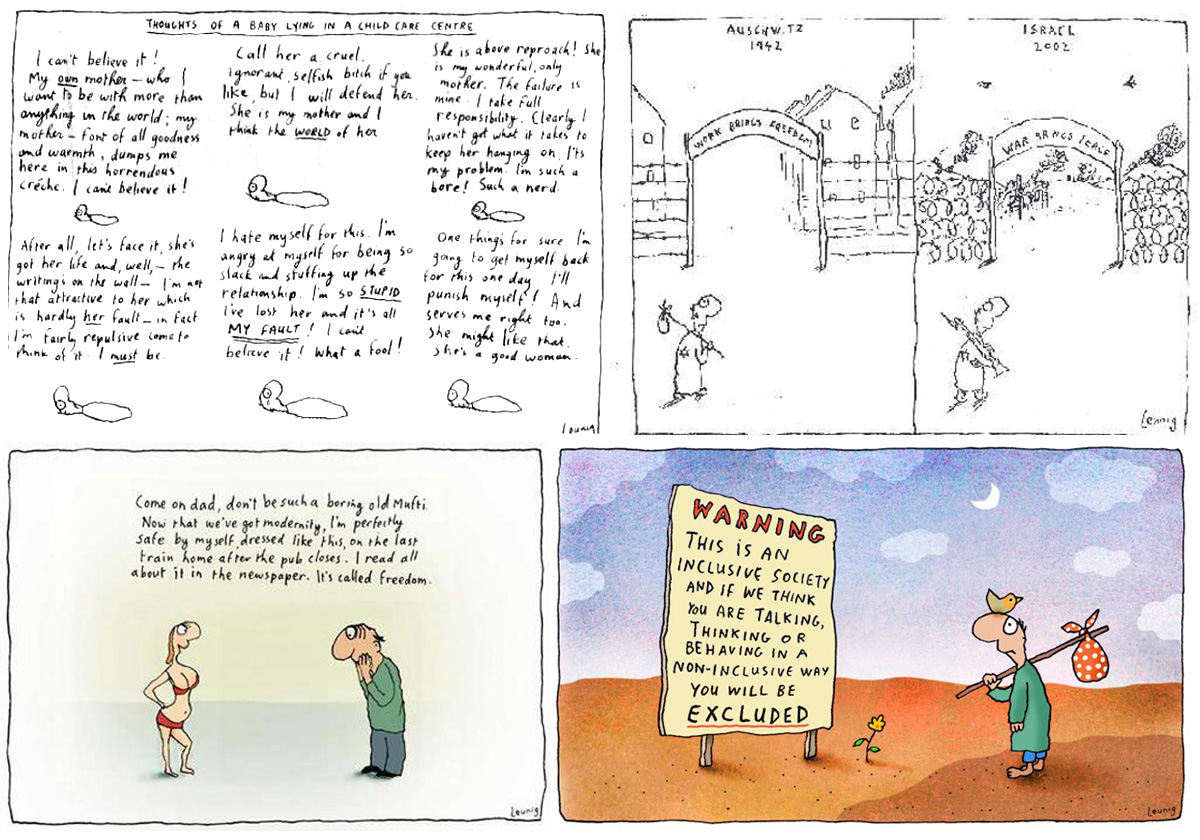 Australian cartoonist Michael Leunig is a perfect exemplar of the power and necessity of editorial cartoons. Although too often for my liking he generally peddles a blandly PC editorial line, occasionally he comes out with something jaw-droppingly audacious. His Thoughts of a baby in childcare cartoon set off a early-culture-war firestorm. His cartoon likening Israel to Auschwitz was ridiculously offensive. Leunig has also kicked back against the censoriousness of PC-culture.
