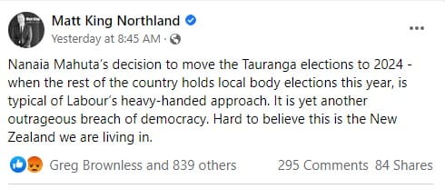 Nanaia Mahuta’s decision to move the Tauranga elections to 2024 – when the rest of the country holds local body elections this year, is typical of Labour’s heavy-handed approach. It is yet another outrageous breach of democracy. Hard to believe this is the New Zealand we are living in.