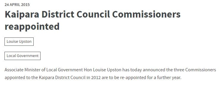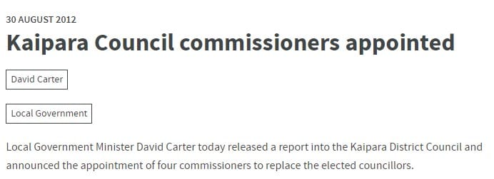 Let’s turn the clock back to the last time commissioners were appointed to run a local authority: August 2012. Kaipara District Council found themselves in a bit of bother so the Minister for Local Government, David Carter (National) appointed commissioners to run the Council.