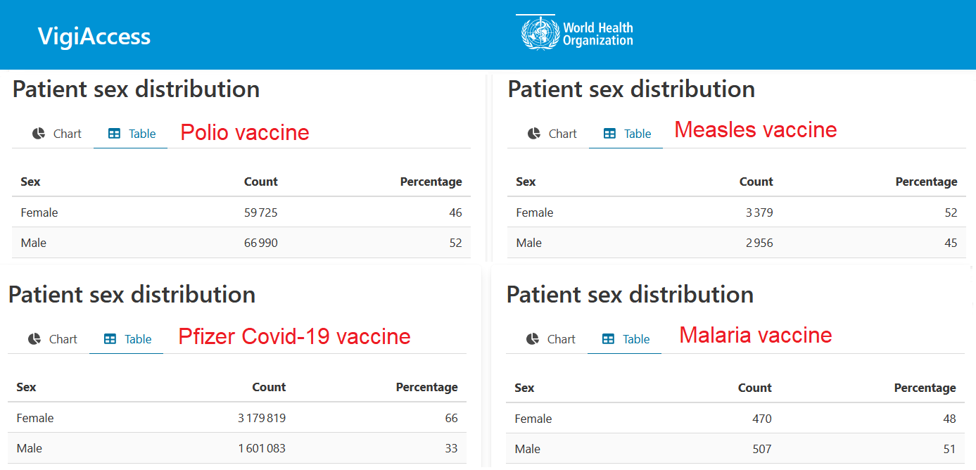 I wrote to several parties, including ‘experts’, MOH, Medsafe, etc, about this. Medsafe delayed, dodged, and eventually said the dog ate their homework (they didn’t, but they might as well have) while leading virologist Dr Helen Petousis-Harris answered that perhaps due to women having better self-health awareness they therefore have higher reporting rates. Dr HPH is no slouch, and I have no reason to doubt her suspicion, but is her theory borne out across other vaccine scenarios? I collated three other random specs for AEFI’s as recorded on the WHO’s Vigiaccess page (which keeps stats on these important AEFI matters). You be the judge. One of these, as they say, is not (at all) like the others: