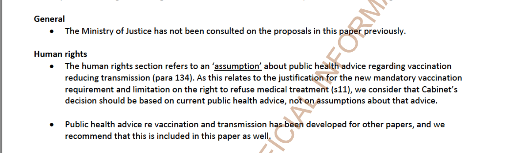 In emails sent from the Ministry of Justice Advisors to the Prime Minister’s advisors at the time, the MoJ required rightly required further evidence the vaccine prevented transmission in order to proceed with the mandates legally.