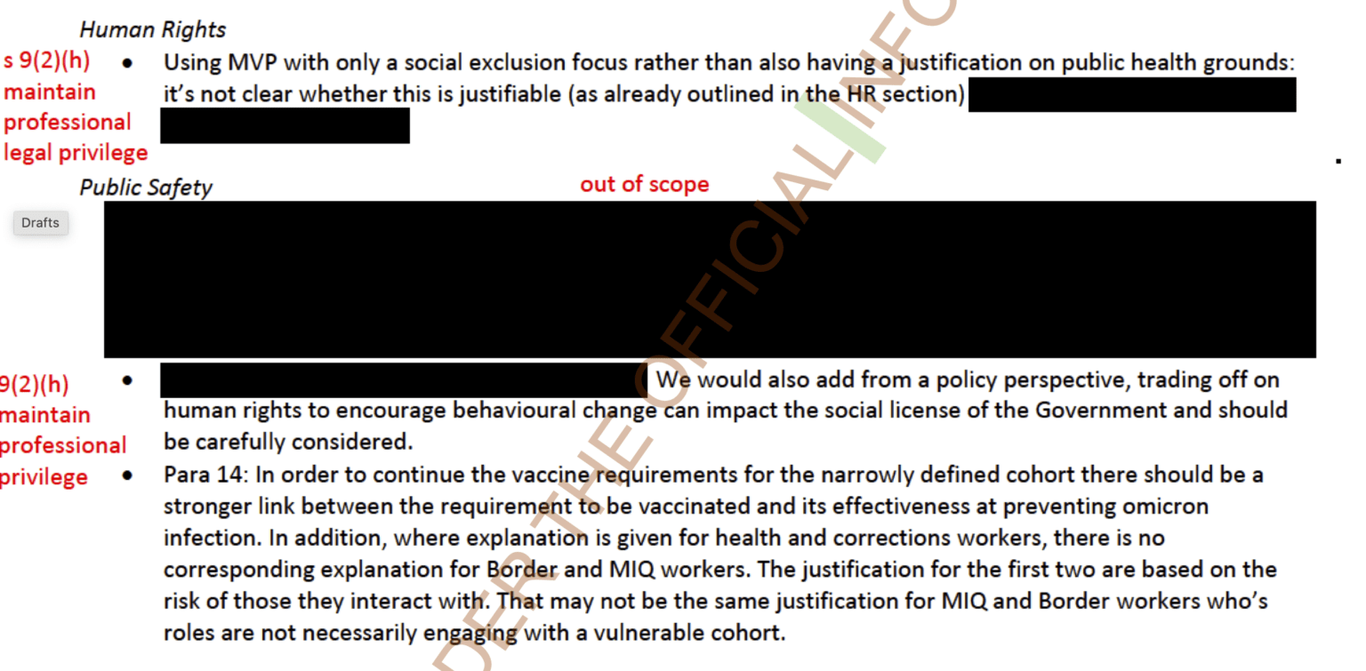 Documents obtained through OIA from the Ministry of Justice (MoJ), primarily to the Office of the Prime Minister or the Minister of Covid Response, expressed significant concern about needing to provide clear and sufficient evidence that the vaccines were effective in preventing transmission, to justify the mandates. (But note that sadly there was no questioning of the severity of the illness itself by government lawyers. Presumably, they confined themselves to the ‘only source of truth’ on that one.)
