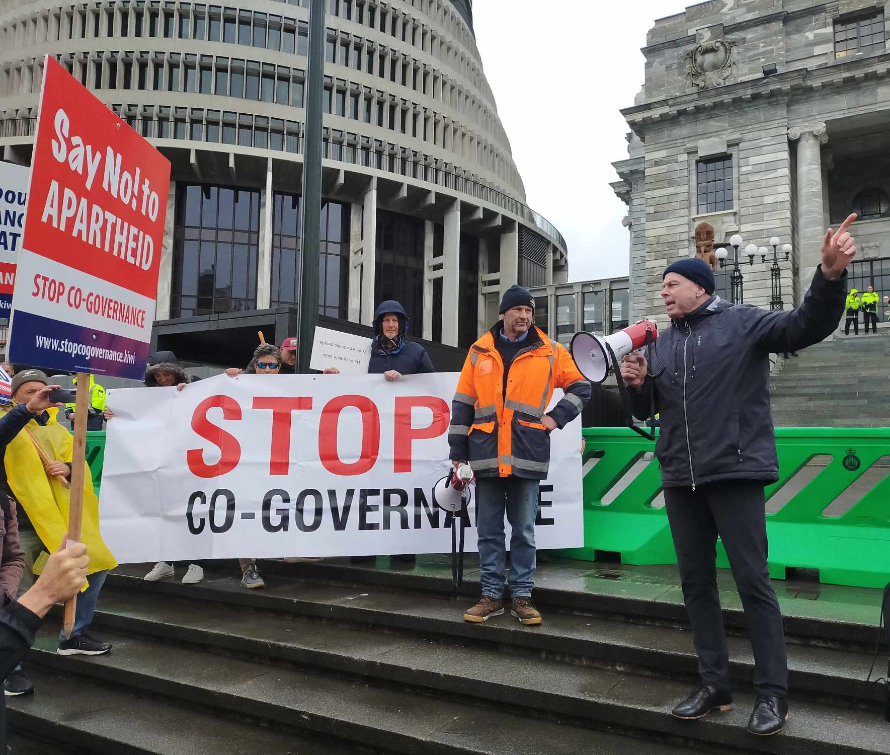 On the steps of Parliament, Stop Co-Governance founder Julian Batchelor addressed his supporters with a megaphone but had to compete with the sound of the counter-protesters singing as well as an Antifa speaker whose words were amplified through a sound system.