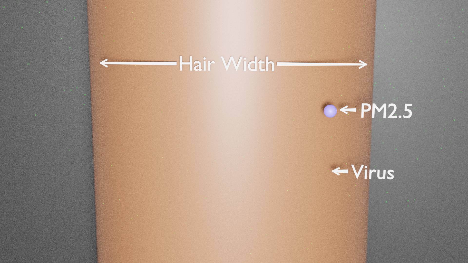 A typical coronavirus is about 0.1 microns. In the above (scaled) image, virus particles are represented by the small green specs and I have also included a blue sphere that represents 2.5 microns for comparison. The brown strand of hair represents a width of 70 microns. This should highlight how many virus particles could easily fit through a gap even the width of a single human hair. How many people have gaps of at least 1 cm at the sides of their masks?