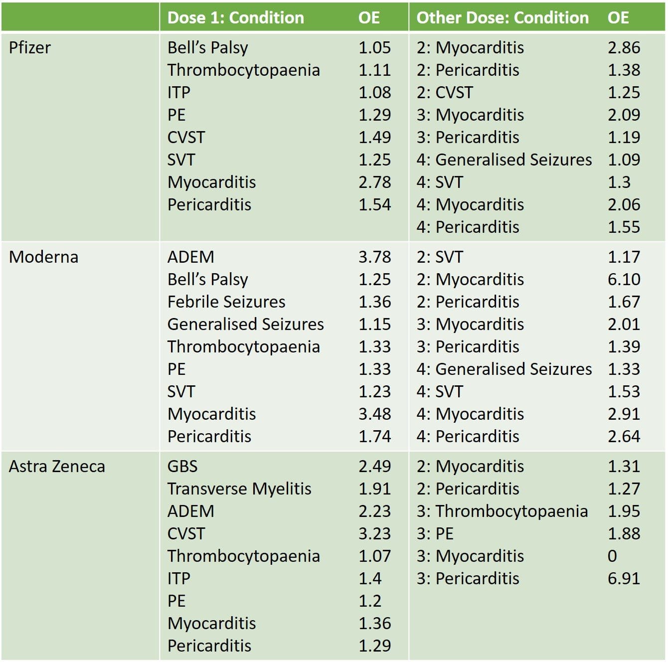 The observed vs expected rates (OE ratio) of each event were compared across the three different genetic injections (both mRNA and DNA based). The OE ratio represents how many times higher the rate of an observed condition occurs compared to the expected background rate. The results are summarised in this table.