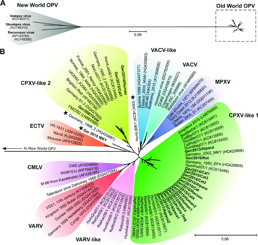 The other abbreviations at this particular zoo are CPXV (cowpox), VARV (variola aka smallpox), CMLV (camelpox), ECTV (ectromelia), and VACV (vaccinia, which is the virus used in production of smallpox vaccine). Then the newer orders of volepox, skunkpox and racoonpox.