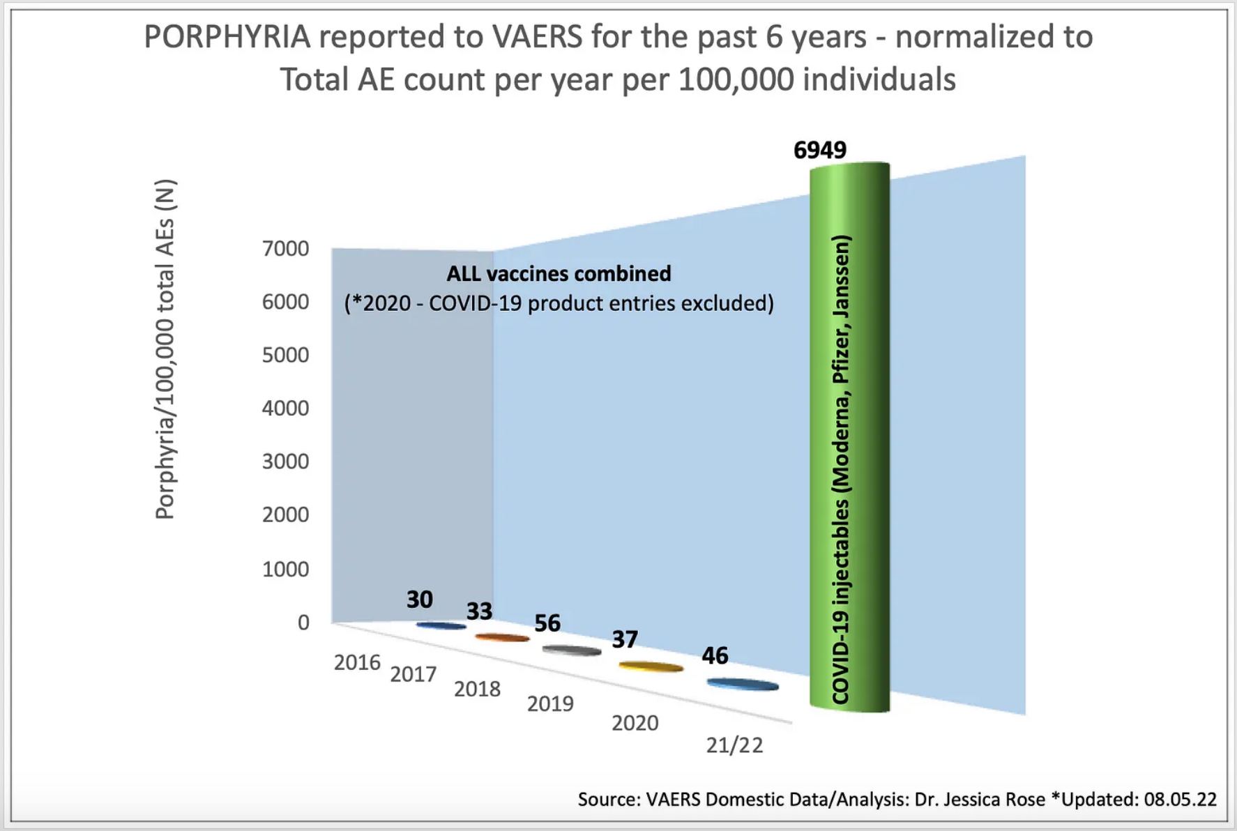 She seems qualified to offer scientific hypotheses without being labelled a “conspiracy theorist”. Porphyria cutanea tarda symptoms include blistering rashes to the skin, resulting from damage to the metabolism of red blood cells. Dr Rose concludes that amongst the many conditions that circulating spike protein can cause, the rare disease of porphyria is one, and occurring at an enormous rate as an adverse event following inoculation with Covid-19 injectables.