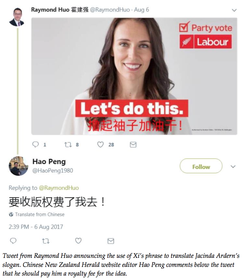 Xi’s catchphrase has been widely satirized in Chinese social media. Nonetheless, the phrase is now the politically correct slogan for promoting OBOR, both in China and abroad. The use of Xi’s political catchphrase in the Labour campaign indicates how tone-deaf Huo and those in the Chinese community he works with are to how the phrase would be received in the New Zealand political environment. In 2014, when asked about the issue of Chinese political influence in New Zealand, Huo told RNZ National, “Generally the Chinese community is excited about the prospect of China having more influence in New Zealand” and added, “many Chinese community members told him a powerful China meant a backer, either psychologically or in the real sense.”