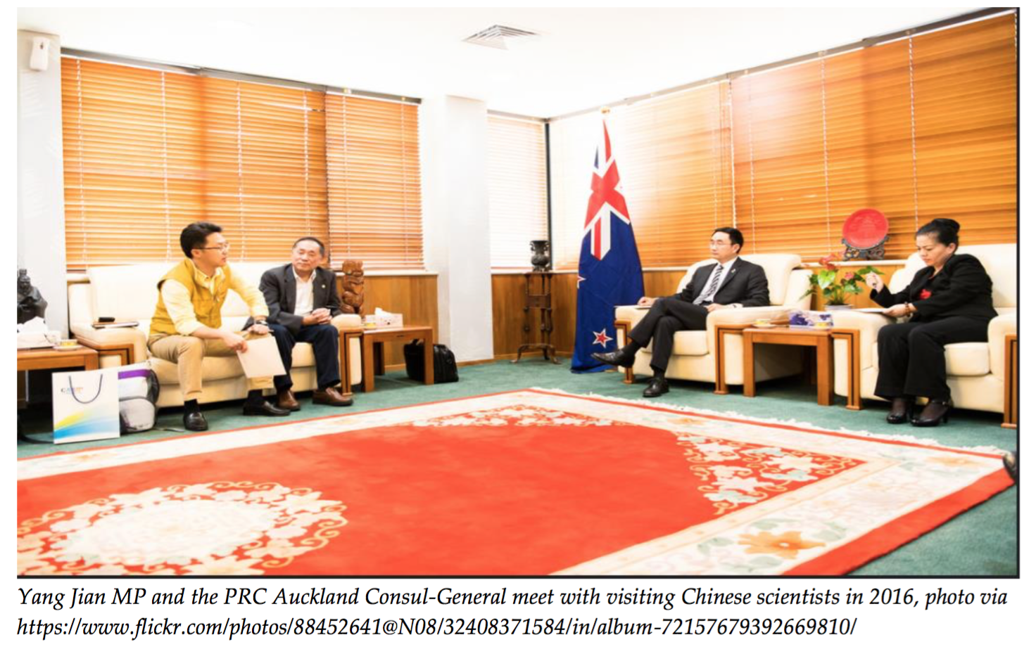 Since he entered parliament, Yang has been a central figure promoting and helping to shape the New Zealand National government’s China strategy and been responsible for their engagement with the New Zealand Chinese community. From 2014-2016, Yang Jian was a member of the Parliamentary Select Committee for Foreign Affairs, Defence and Trade. Yang accompanied New Zealand PM John Key and his successor PM Bill English on trips to China and in meetings with senior Chinese leaders when they visited New Zealand. This role would have given him privileged access to New Zealand’s China policy briefing notes and positions.