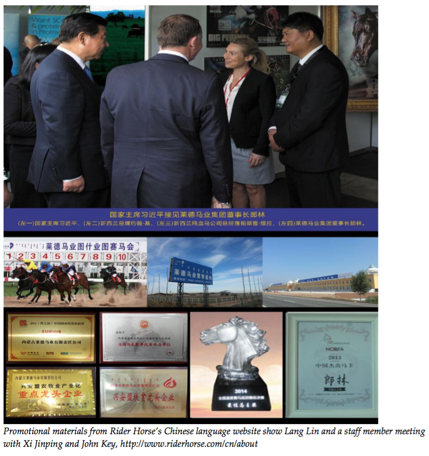 In 2017 Lang Lin, owner of Inner Mongolia Rider Horse Industry (NZ) Ltd donated $150,000 to National. Lang’s company is backed by the Chinese government investment firm CITIC (China International Trust and Investment Company), who are sponsoring his bid to expand China’s racing industry through importing New Zealand racehorses. CITIC was set up under United Front Work Department auspices.