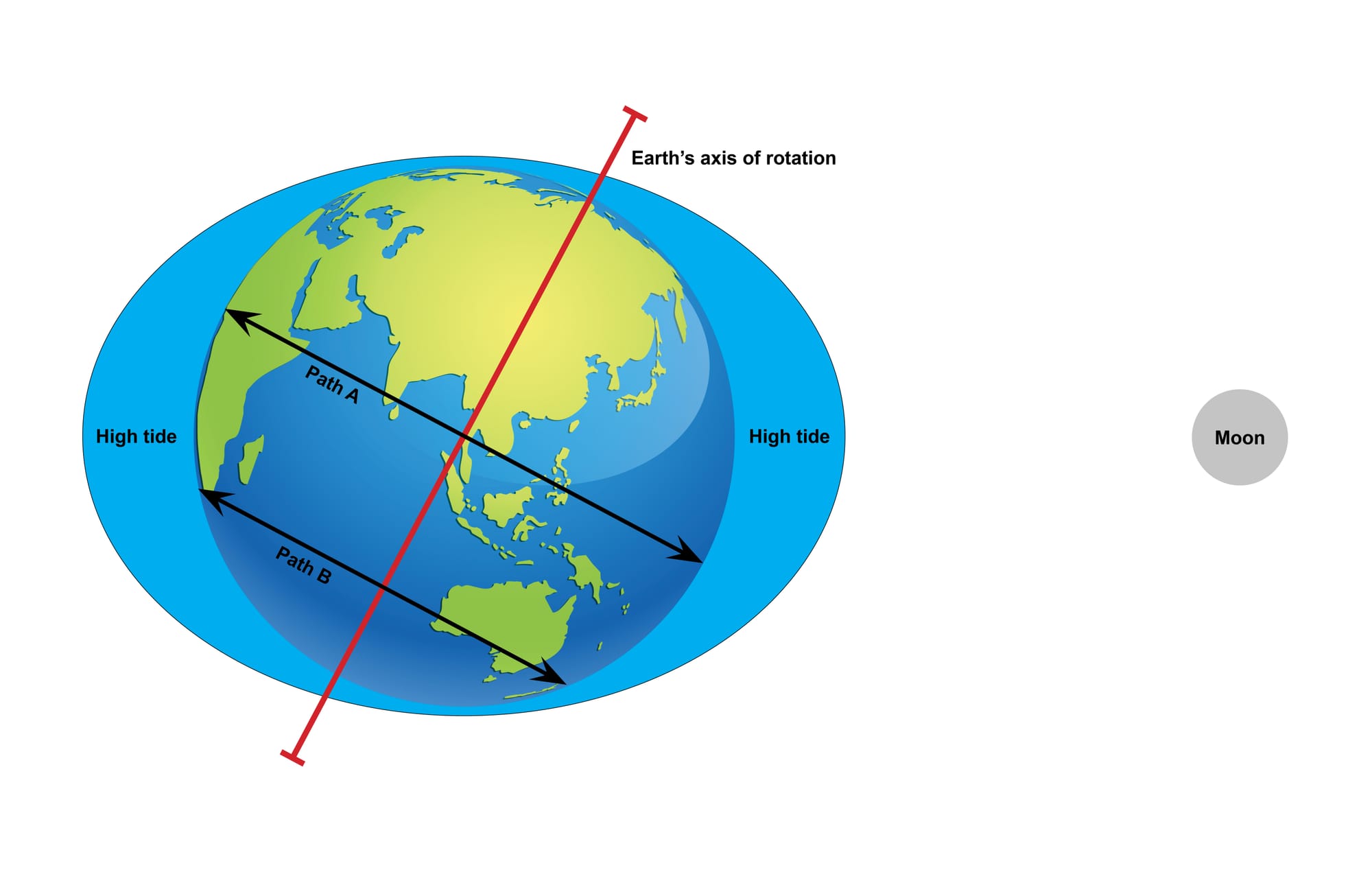 That means the tides don’t get pulled evenly around the equator. The Earth spins at an angle to how the tides move, so certain parts of the world can pass through one high tide bulge but not the other.