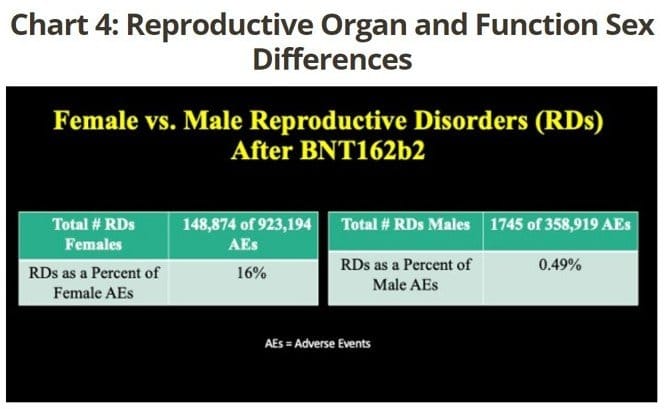 Despite the array of concerns for male reproductive health, the Pfizer trial documents show that in comparison to males, mRNA injections cause 2.5 times more severe adverse events to women, and three times more risk to female reproductive organs and their function, according to Report 37 at Daily Clout. Dr Wolf discussed these harms with report author, orthopaedic surgeon Dr Robert Chandler, in late August.