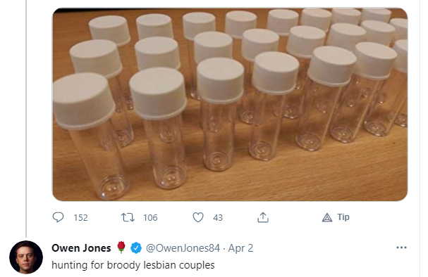Guardian writer Owen Jones is the epitome of the woke, soy male. On Twitter recently, Jones announced that he was “hunting for broody lesbian couples”. As Jones made clear, these lucky women were destined to be receptacles for his precious seed in order to satisfy his craving for a trophy baby. Jones’s tweet showed that he holds women with as little regard as a race-horse trainer on the market for a broodmare.