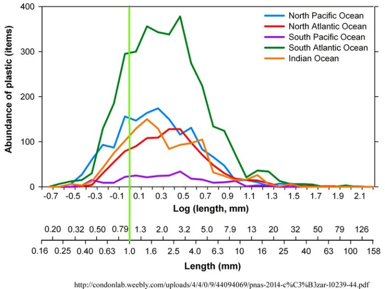 Once the pieces of plastic in the ocean got below 1 mm in size the quantity dropped off significantly and there were almost none below 0.5 mm. Why?