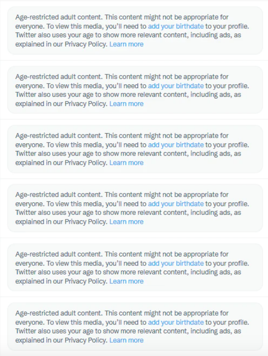 If you enjoy the interviews, please spread them around. I am being pretty severely censored and otherwise “deboosted” by Twitter and Facebook. For example, here’s what the Consent Factory’s Twitter timeline looks like. Each “age-restricted adult content” warning is a tweet …