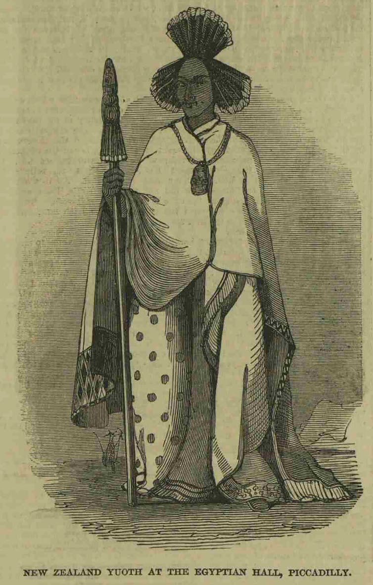 Hemi appeared at the British and Foreign Institution, followed by a private audience with Queen Victoria and Prince Albert. From April 1846, he was put on display in his chiefly attire as a living tableau in front of Angas’s watercolours and alongside ethnographic material at the Egyptian Hall, London.