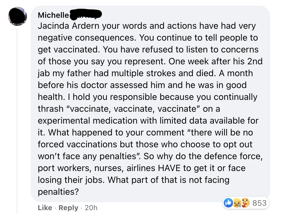 One commenter on Ardern’s Facebook page asked a rather impertinent question; “Why aren’t mainstream media covering this when there is obviously so much public concern and harm resulting from the vaccine, especially to our children? It would suggest they are now merely government puppets.”