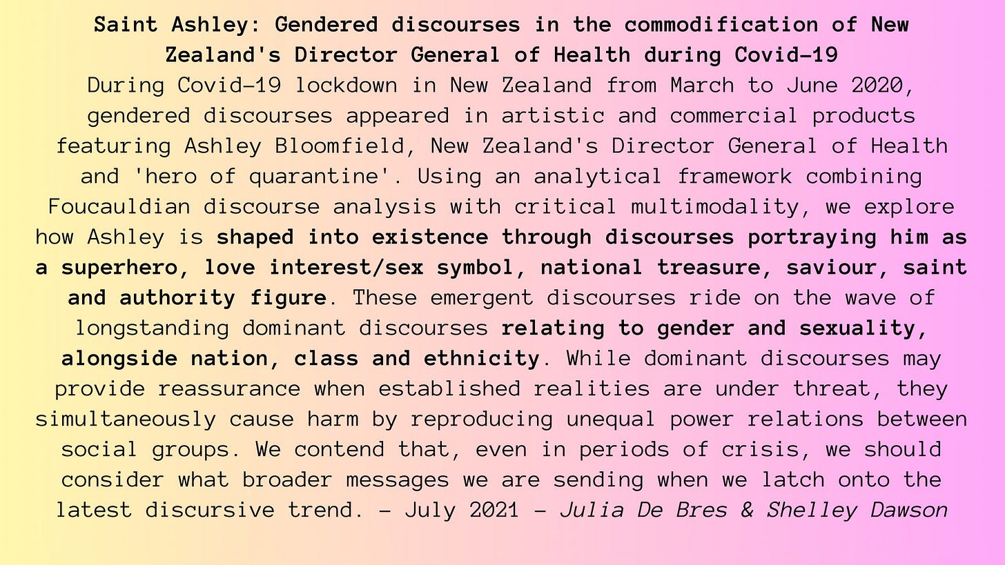 In July 2021 Academic linguists Julia de Bres and Shelley Dawson publish “Saint Ashley: gendered discourses in the commodification of New Zealand’s Director‑General of Health”, showing how merch and art cast him as “superhero, love interest/sex symbol, national treasure, saviour, saint and authority figure”.