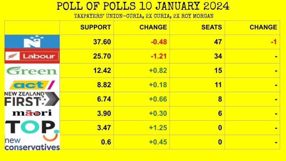 Now onto my predictions for 2024. There have been five polls since the election, one from Curia for the Taxpayer’s Union, two from Roy Morgan and two from Curia for corporate clients. The change in support shown is compared to the election night result. Assuming Te Pati Maori hold their electorates, there will be a 121-seat Parliament, down two seats from the current 123-seat Parliament.