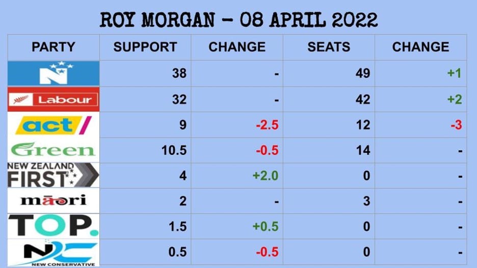 The Poll of Polls includes the March and April Roy Morgan polls, the February and March Curia polls and the March Kantar (formerly Colmar Brunton) poll. Again, ACT loses the most support with a drop of 0.9% with National gaining 0.6% and New Zealand First 0.3%.