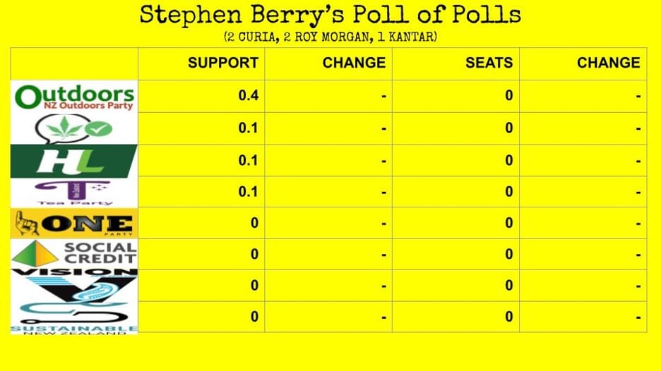 (Note: Only the Kantar poll regularly provides polling results for Outdoors, ALCP, Heartland, Tea Party, One Party, Social Credit, Vision and Sustainable NZ, so the poll-of-polls will only register unchanged support assuming a Kantar poll is at least one of the previous five public polls published.)