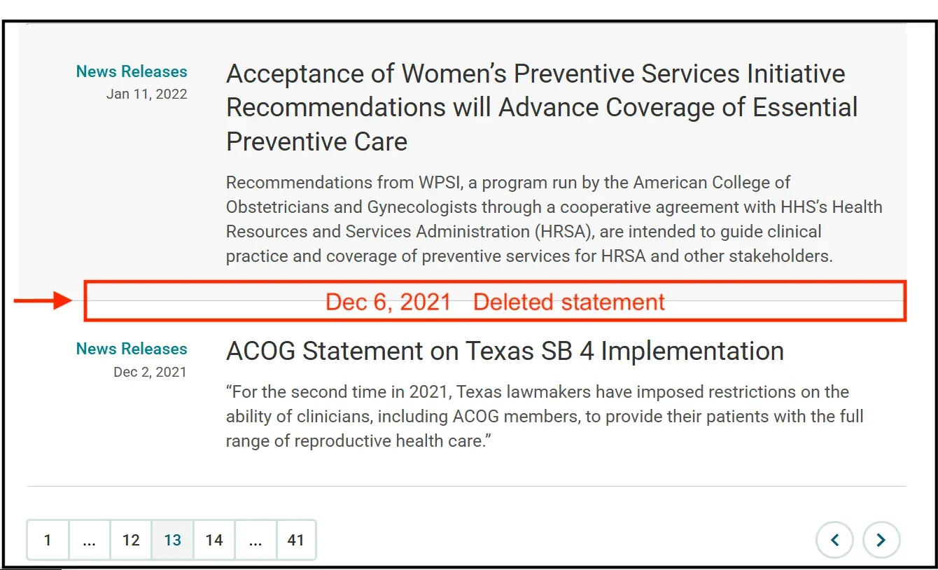 Today, the December 6, 2021 mandate statement no longer appears in ACOG’s searchable news archive.